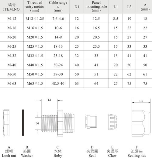 •产品特性:特殊夹紧爪与夹紧圈之设计,夹紧电缆范围大,抗拉力特强并具保护电缆作用,可防水、盐、耐弱酸、酒精、油油脂及一般溶剂。
